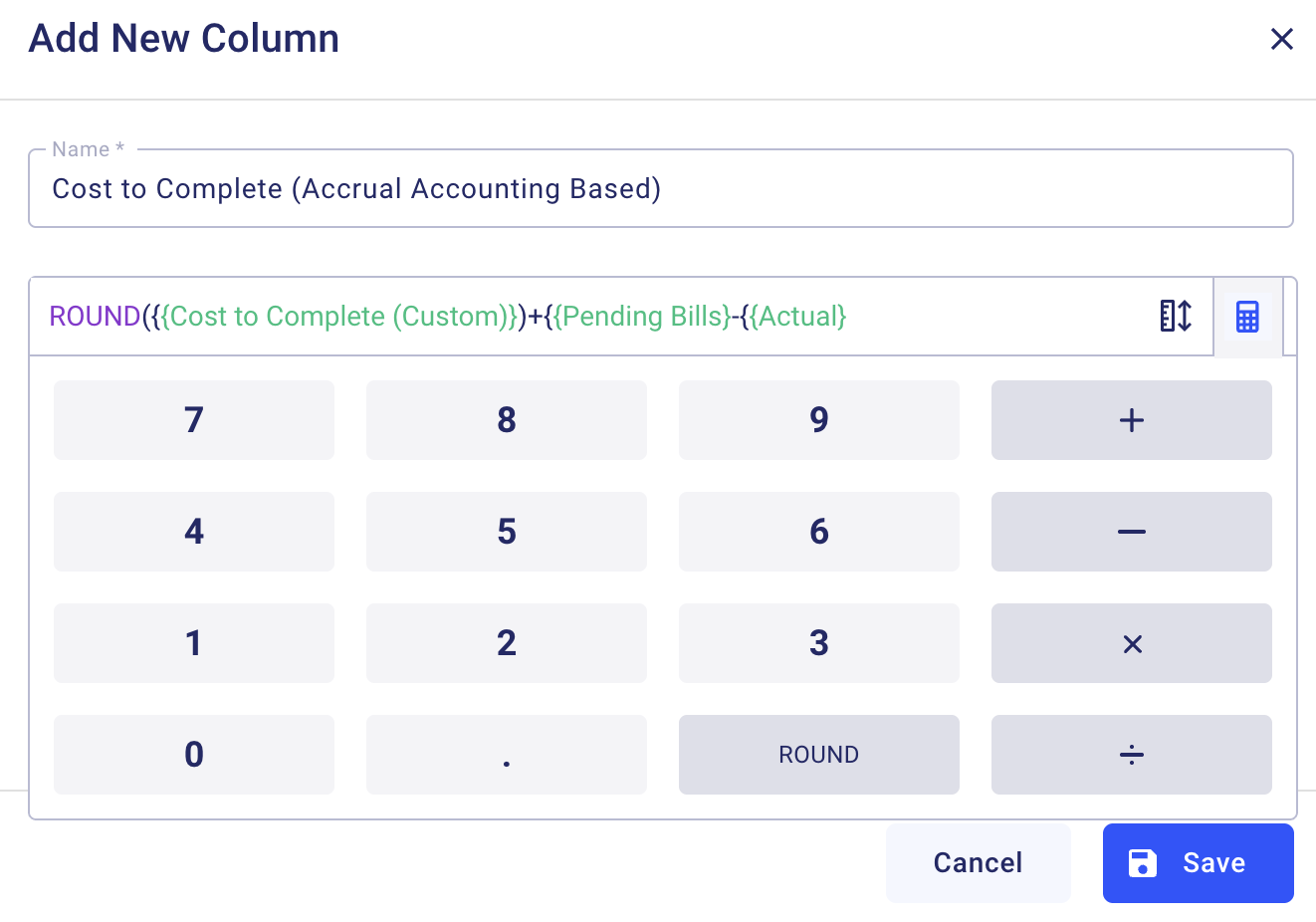 You can also utilize the Calculator button to round numbers or to use standard operators (+, -, x, ➗) to build your formula. From the column creation page click the calculator button and start building you formulas from it.