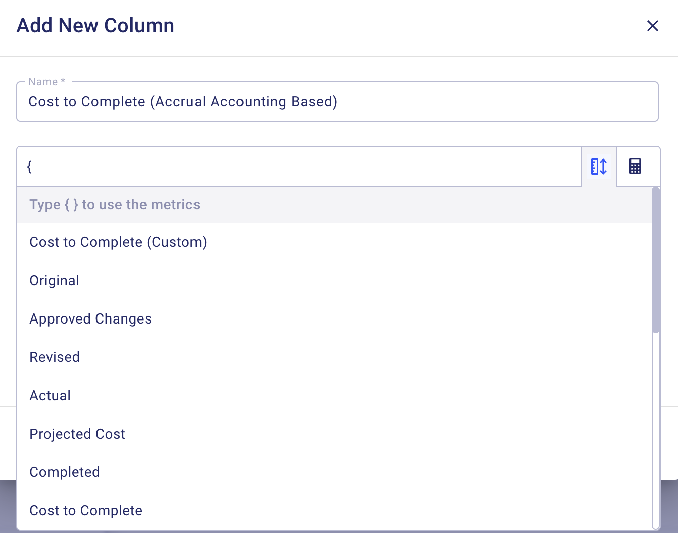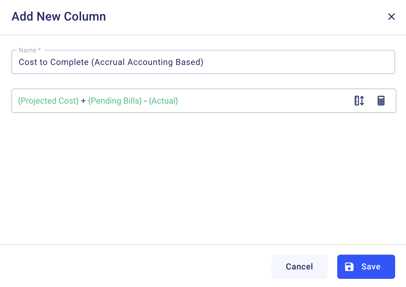 Start your formula by typing "{" — this will open a list of available fields such as {Projected Cost}, {Pending Bills}, {Actual}, etc.